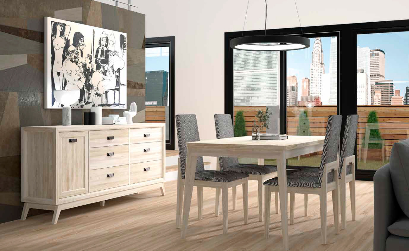 Este comedor tiene un aspecto agradable. Su aparador de patas altas tiene un diseño de líneas rectas que gracias a la variedad de cajones y a la puerta que posee, logramos un lugar para almacenaje. A juego nos encontramos el conjunto compuesto por una mesa rectangular también de líneas rectas y un juego de sillas tapizadas con un tejido muy original. Todo este mobiliario tiene su terminación en un color neutro, haciendo del espacio un lugar de paz y tranquilidad donde pasar un rato agradable. |