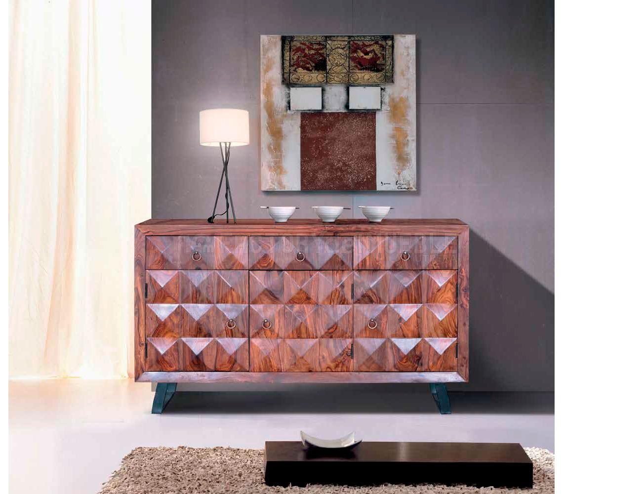 ACCEDEREste mueble aparador es de estilo Vintage, presenta tres puertas y tres cajones con estantes interiores. Esta fabricado en madera de palisandro, la cual le proporciona al mueble una excelente belleza y una alta duración. Este modelo presenta una bancada metálica decorativa que le proporciona un diseño muy novedoso.