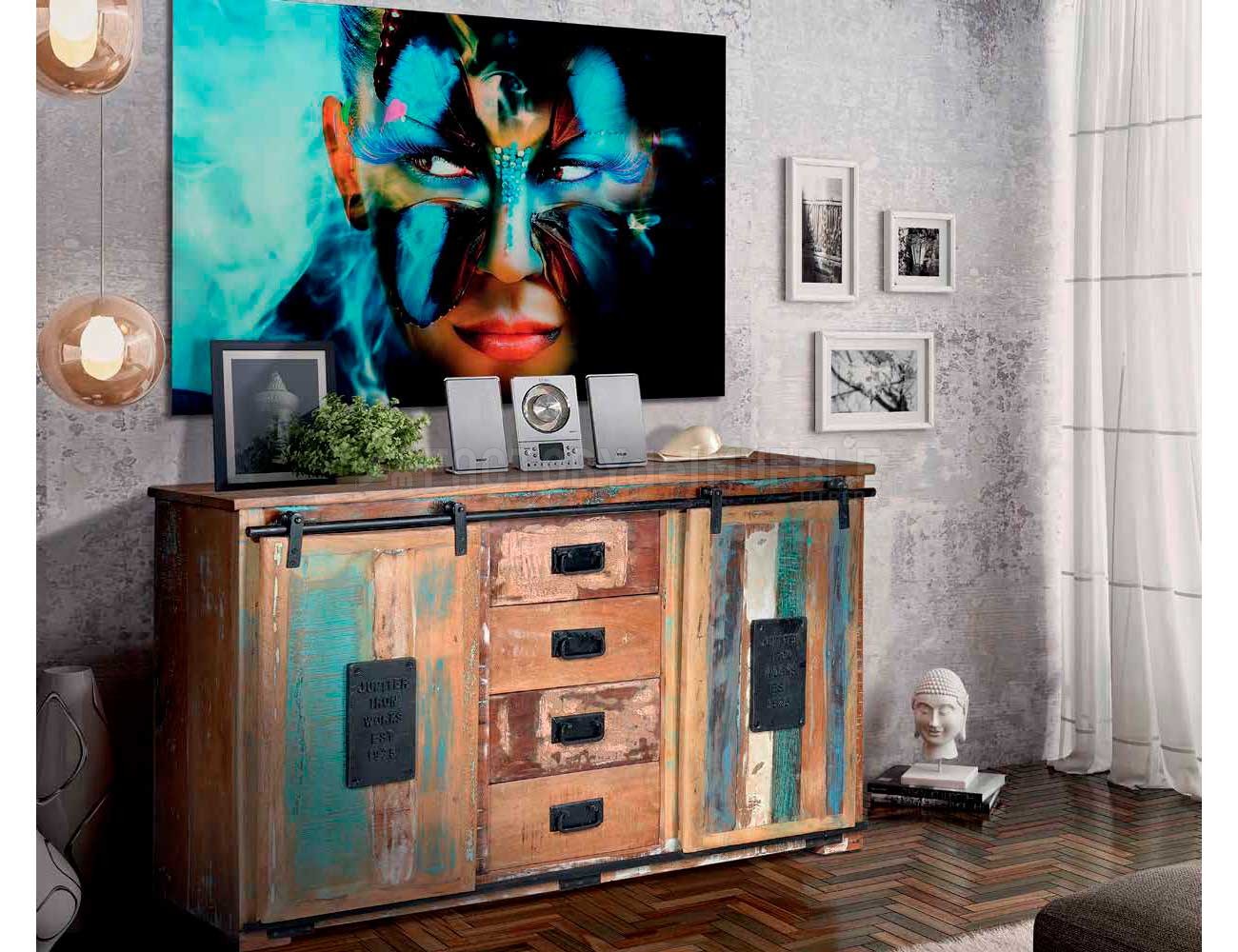ACCEDEREste mueble aparador es de estilo Vintage, presenta dos puertas, correderas y cuatro cajones en su interior posee varios estantes. Esta fabricado en madera reciclada, la cual le proporciona al mueble una excelente belleza y una alta duración
