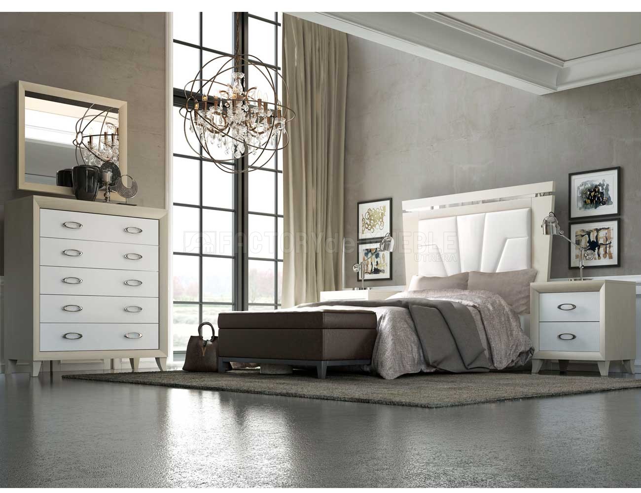 Estas composiciones se caracterizan por llevar cabeceros altos y muy elegantes, siendo el elemento más llamativo de la decoración del dormitorio. Podemos observar que en este ambiente se ha elegido un cabecero con dibujo en forma de "V" y se presenta con una altura total de 150 cm. Este cabecero se puede solicitar tapizado en polipiel y terciopelo. Tanto la cómoda como las mesitas de noche llevan zócalo. Estos muebles presentan altas calidades y están fabricados en madera y Dm para los lacados.