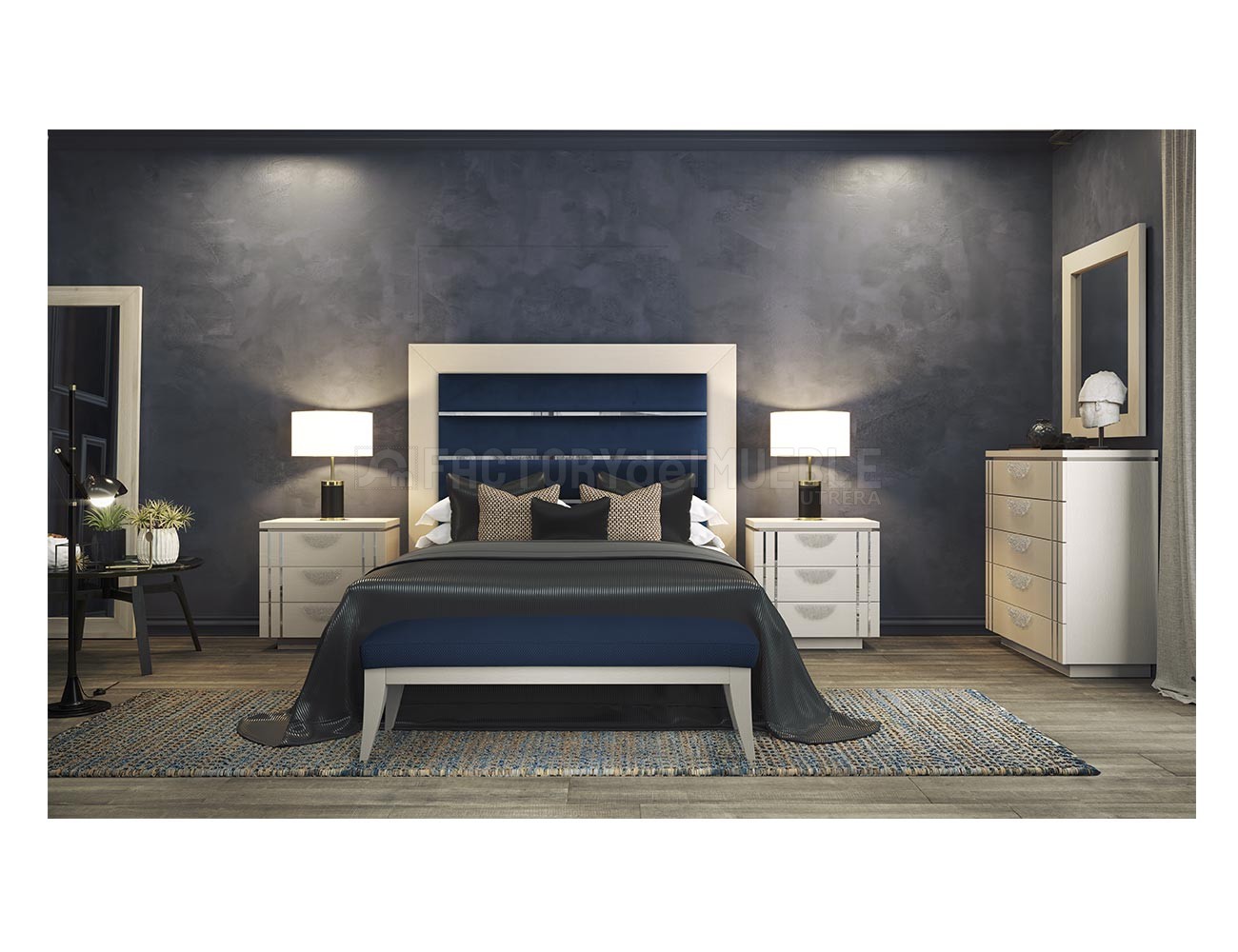 Estas composiciones se caracterizan por llevar cabeceros altos y muy elegantes, siendo el elemento más llamativo de la decoración del dormitorio. Podemos observar que en este ambiente se ha elegido un  cabecero con dibujo en forma de "V" y se presenta con una altura total de 150 cm. Este cabecero se puede solicitar tapizado en polipiel y terciopelo. Tanto la cómoda como las mesitas de noche llevan zócalo. Estos muebles presentan altas calidades y están fabricados en madera y Dm para los lacados.
