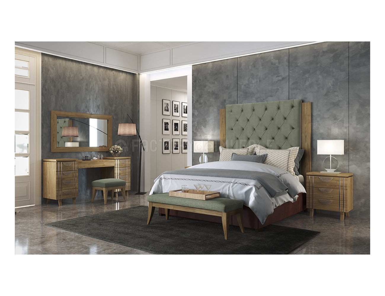 Estas composiciones se caracterizan por llevar cabeceros altos y muy elegantes, siendo el elemento más llamativo de la decoración del dormitorio. Podemos observar que en este ambiente se ha elegido un cabecero con dibujo en forma de "V" y se presenta con una altura total de 150 cm. Este cabecero se puede solicitar tapizado en polipiel y terciopelo. Tanto la cómoda como las mesitas de noche llevan zócalo. Estos muebles presentan altas calidades y están fabricados en madera y Dm para los lacados.