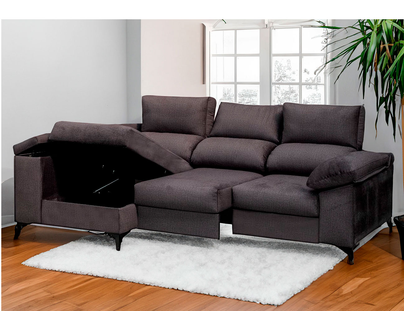 Armazón de pino gallego y costados de tablero de partículas.Bastidor con mecanismo super-deslizante con muelle zig-zag y ruedas al suelo.Respaldos y brazos de fibra 100%.Asientos de gomaespuma D-26 kg. recubiertos de fibra.Mecanismos reclinables de carraca en respaldos.Al abrir los deslizantes del sofá, la chaise se convierte en cama.Incluye arcón en el módulo del chaise-longue y en brazo.Pata alta en negro h12 cm.
