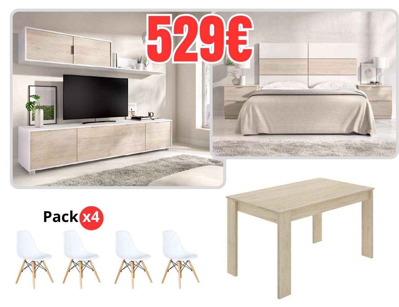 Este ambiente esta compuesto por un mueble de salón, una estantería horizontal, un dormitorio de matrimonio compuesto por dos mesitas de noche con patas y un cabecero mural, una mesa de comedor, 4 sillas estilo nórdico y una mesa de centro elevable con patas nórdicas.