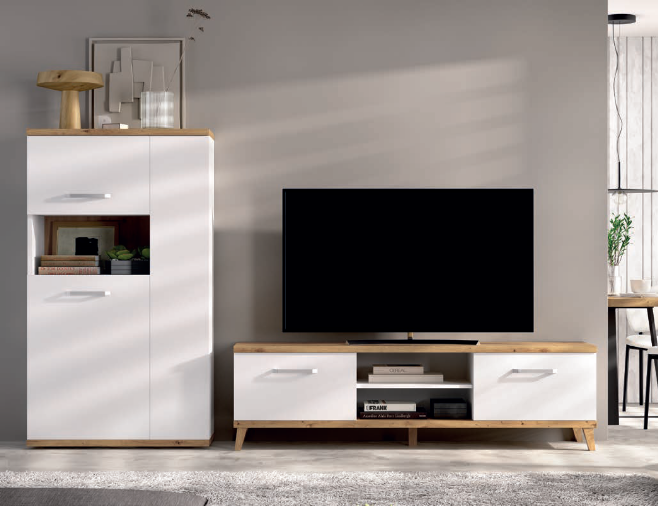 La composición Salón Nórdico revitaliza el diseño escandinavo con un guiño a la estética Mid-Century, destacando por sus patas elevadas que aportan ligereza y facilitan la limpieza. Este modelo combina la calidez del tono madera en la base y tapas con la luminosidad de los frentes en Blanco liso y tiradores minimalistas. El conjunto se completa con un práctico módulo vertical que integra un nicho central abierto, ideal para la decoración y para romper la monotonía del almacenaje cerrado.
