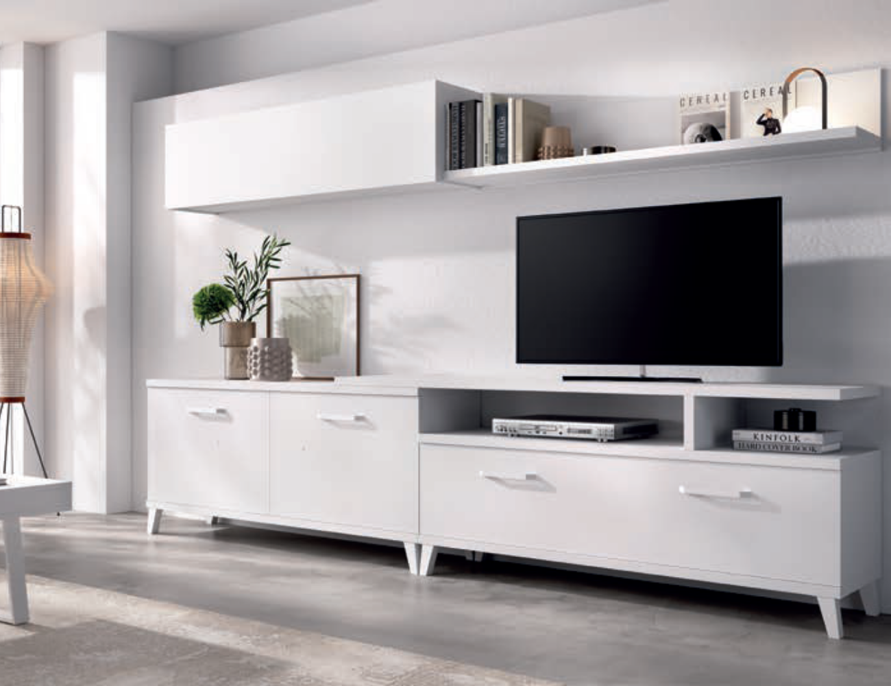La configuración es marcadamente horizontal y flotante, con un amplio mueble de televisión que se complementa con módulos superiores suspendidos. Este enfoque aéreo, junto con su base ligeramente elevada, aporta gran capacidad de almacenaje sin sobrecargar el espacio visual, resultando en un mueble funcional y vanguardista a la vez.
