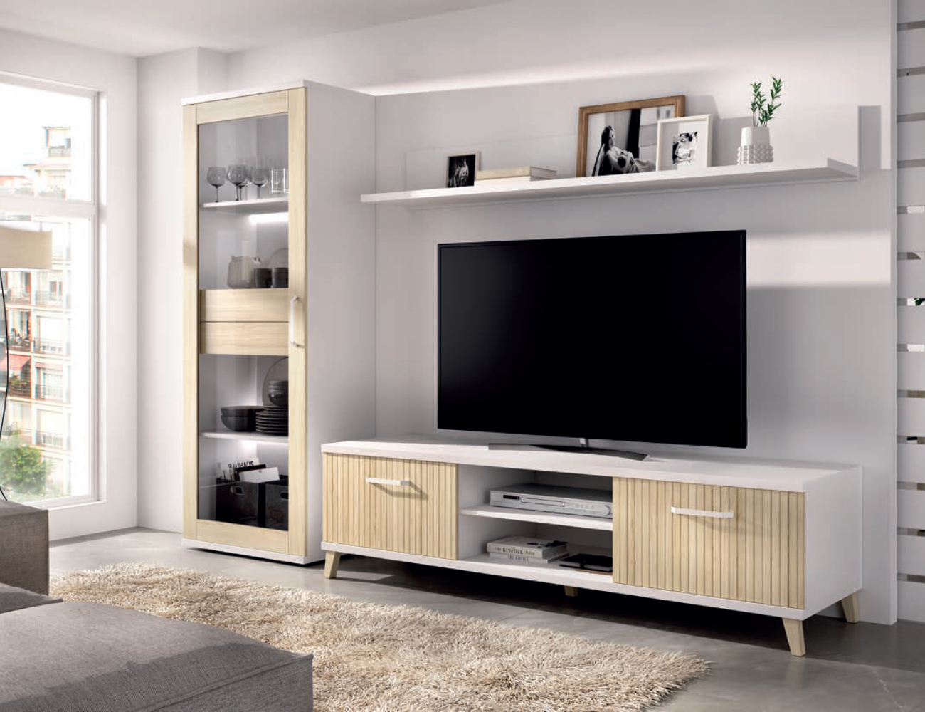 La configuración es marcadamente horizontal y flotante, con un amplio mueble de televisión que se complementa con módulos superiores suspendidos. Este enfoque aéreo, junto con su base ligeramente elevada, aporta gran capacidad de almacenaje sin sobrecargar el espacio visual, resultando en un mueble funcional y vanguardista a la vez.