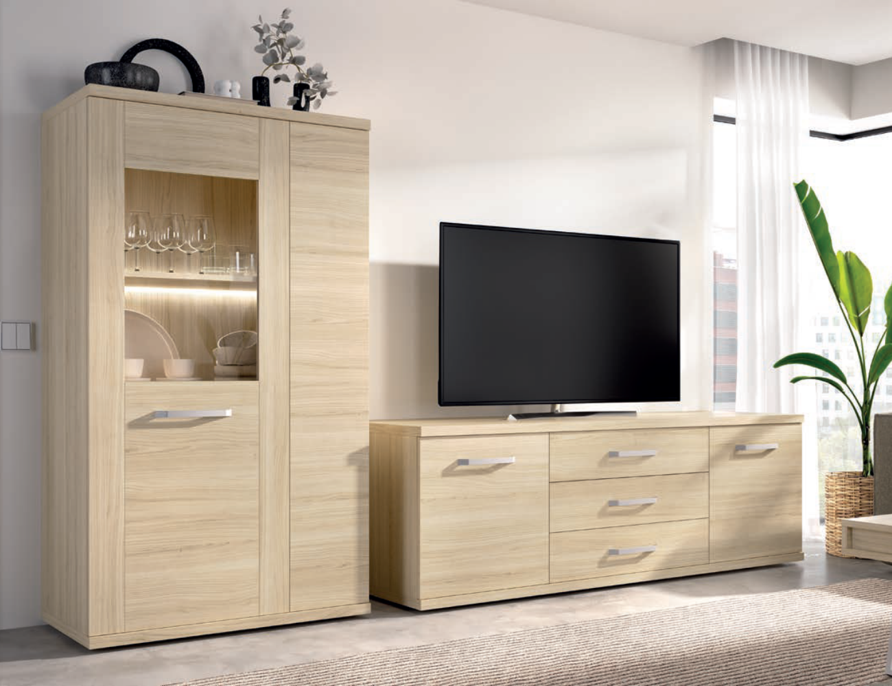 El conjunto es ideal para espacios que requieren una gran organización, dividiendo el espacio en dos bloques funcionales: un módulo alto (vitrina/aparador) para almacenaje vertical y exposición, y un mueble bajo extra ancho que funciona como cómoda y soporte de TV.