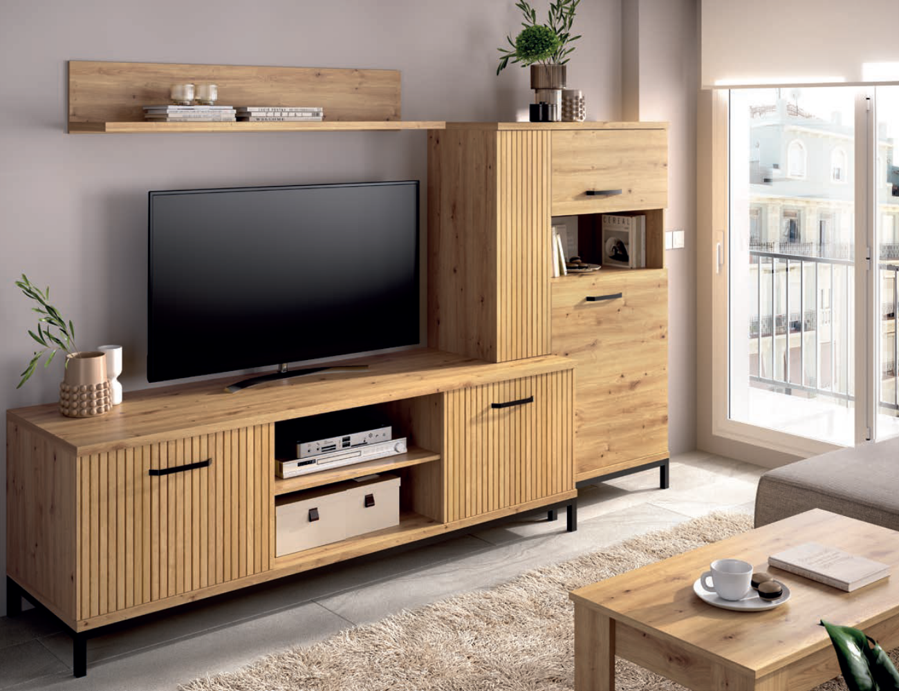 PVPR: 40,00 € 565,72 €Esta composición de salón se caracteriza por su estilo que combina la calidez del acabado Roble con la luminosidad de los frentes en Blanco. Presenta una estética elevada gracias a sus patas, que aportan ligereza visual y un toque de diseño nórdico retro, facilitando la limpieza del espacio. Con un ancho de 260 cm, incluye un amplio mueble de televisión y un módulo vertical que integra un práctico nicho abierto central, ofreciendo un equilibrio perfecto entre almacenaje cerrado y exhibición.