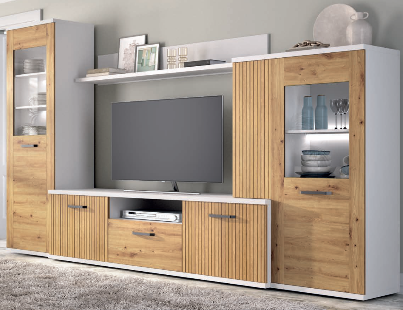 Composición integrada por mueble de televisión, módulo vertical y estante de pared.