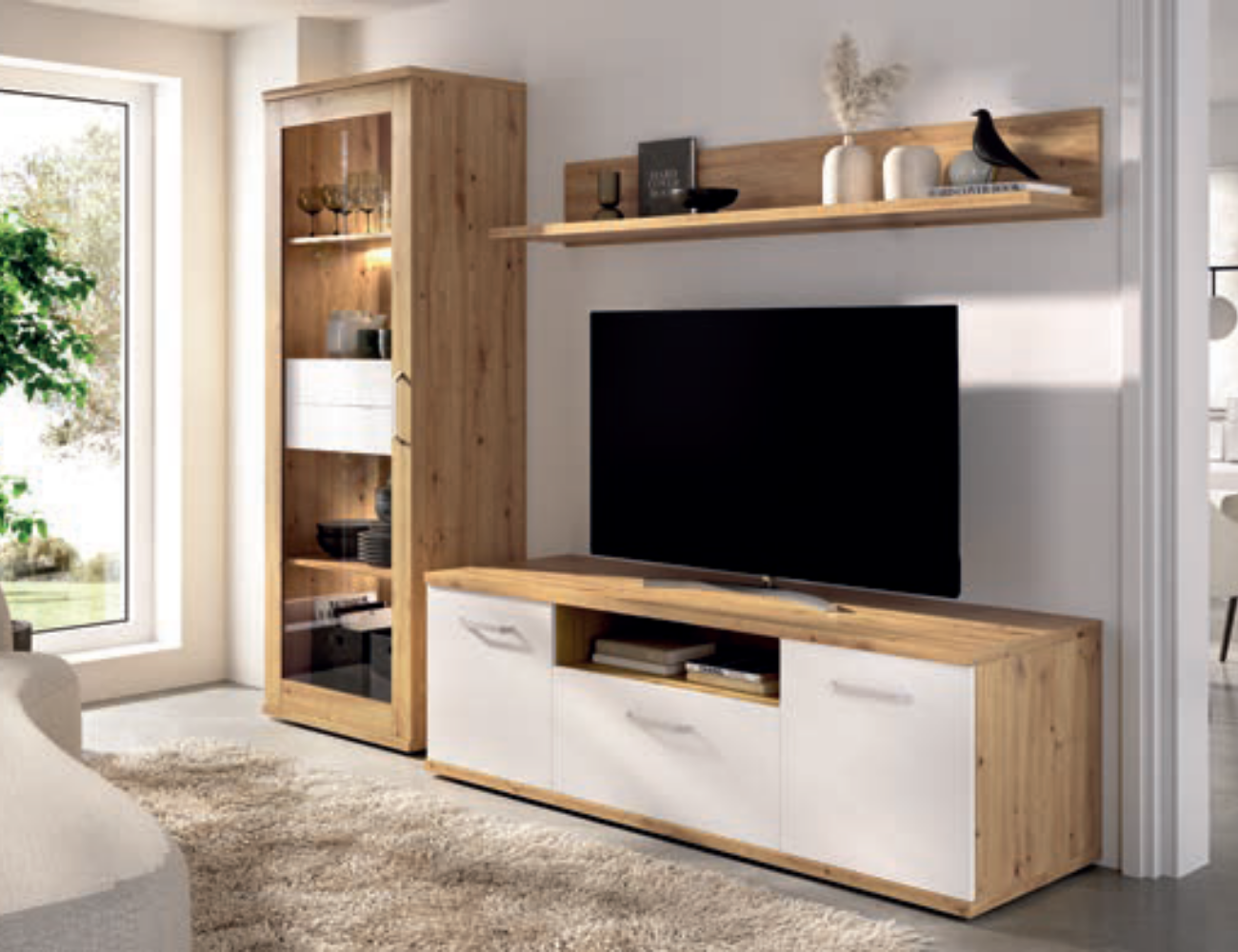 Composición integrada por mueble de televisión, vitrina alta y estante de pared.