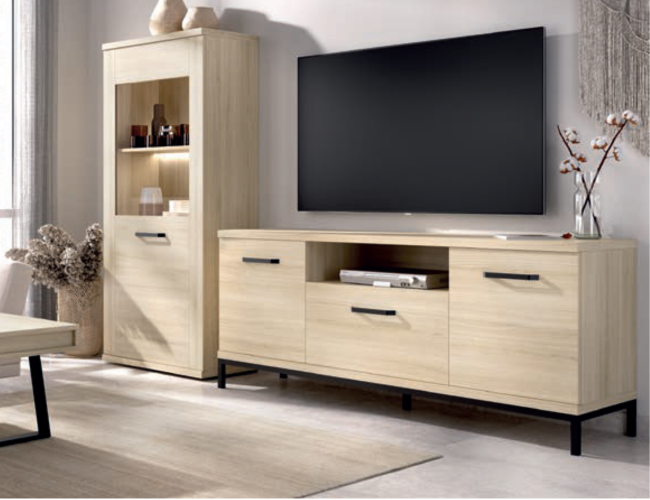 PVPR: 40,00 € 435,52 €La composición de salón presenta un diseño basado en el contraste limpio y funcional, donde la estructura en Nordic (madera clara) enmarca los frentes lisos en Blanco. El conjunto se eleva ligeramente del suelo mediante unas patas cortas y discretas, aportando un toque de ligereza visual. Combina un mueble de televisión ancho que incorpora puertas y un hueco abierto para equipos, con una vitrina vertical alta independiente con puerta de cristal, ideal para la exhibición. El estante superior de pared completa la composición, ofreciendo un espacio funcional para la decoración.