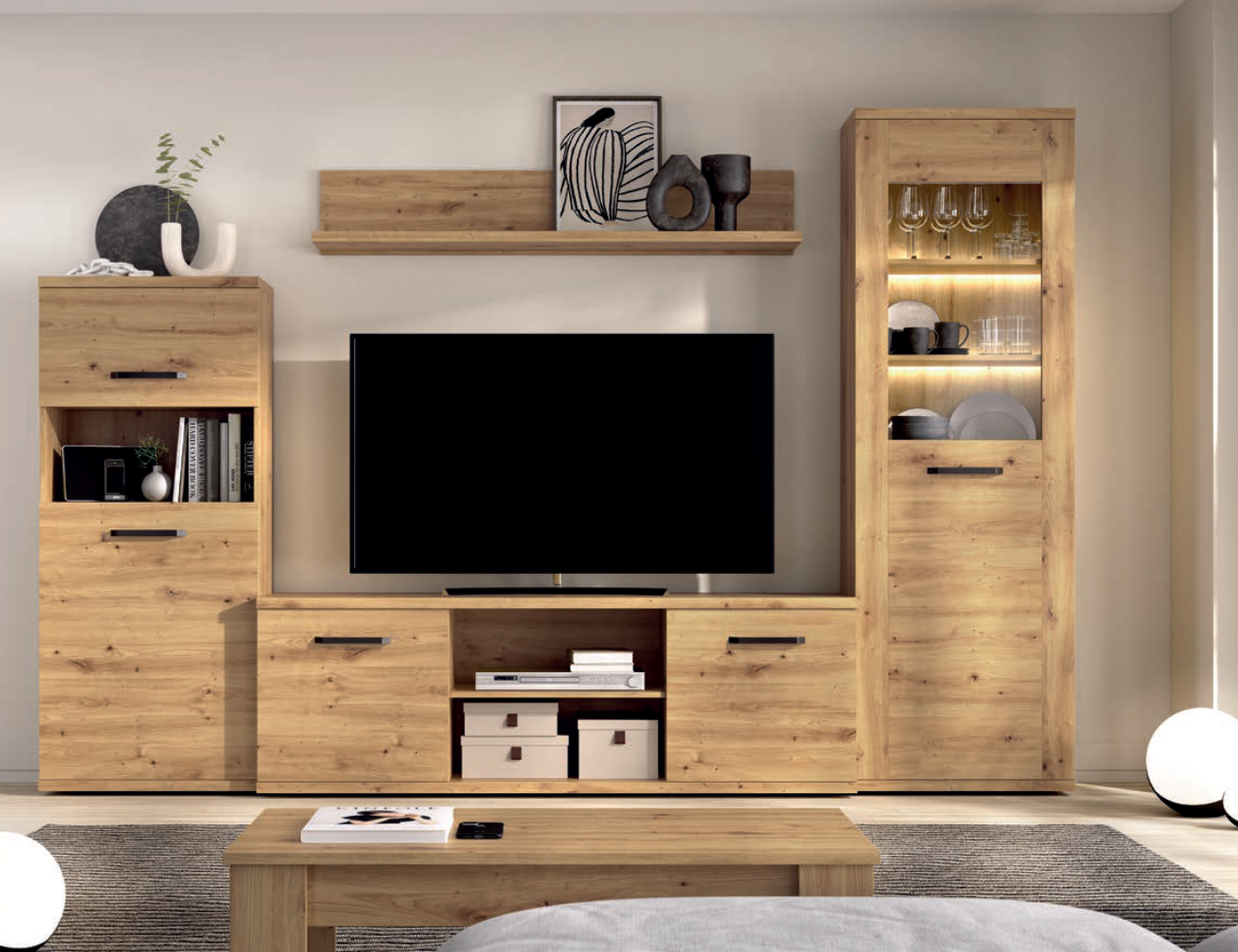 Composición integrada por mueble de televisión, vitrina alta y estante de pared.