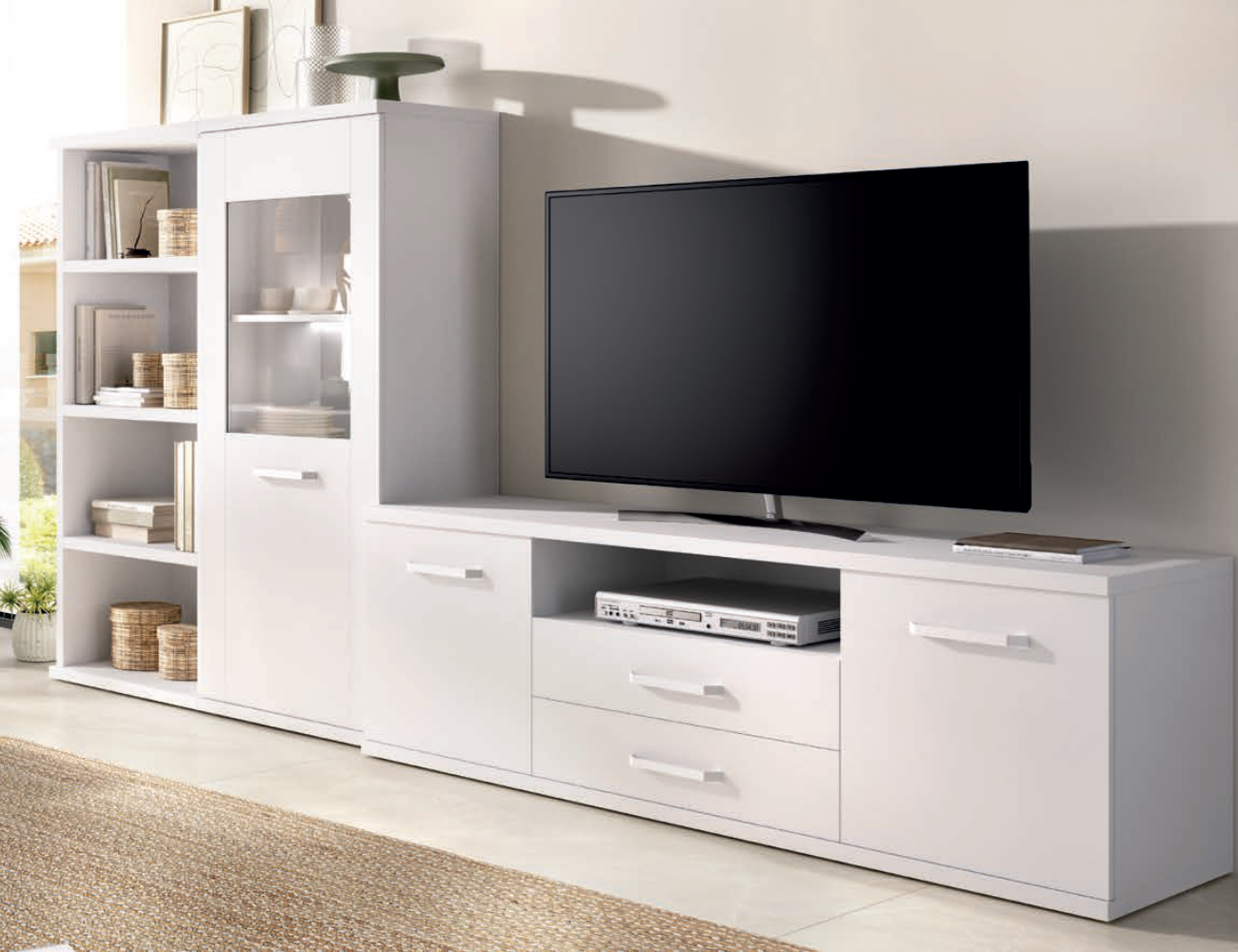Diseño simétrico con mueble TV central y dos vitrinas laterales.