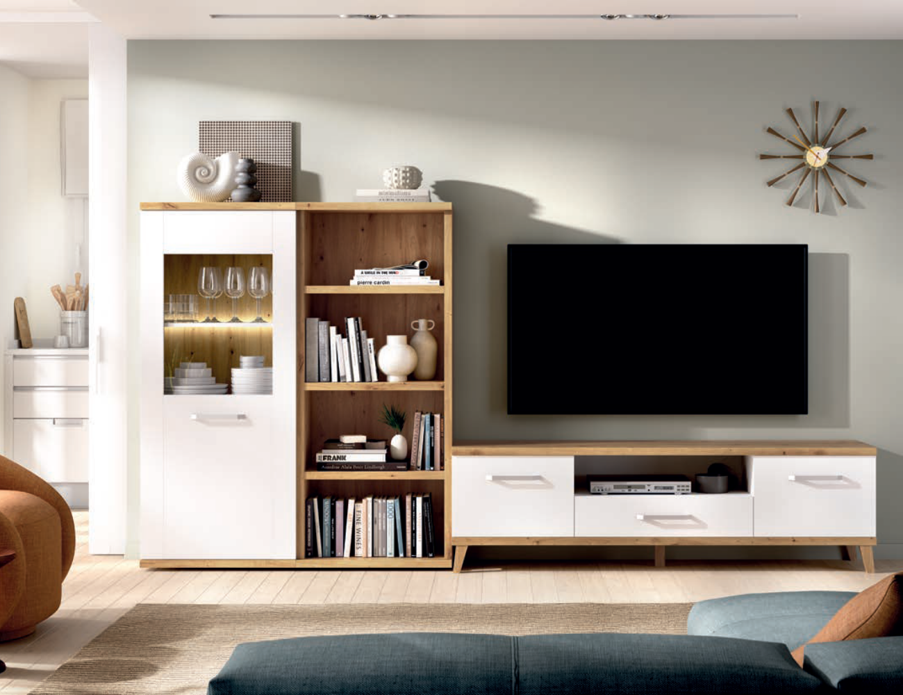 PVPR: 40,00 € 488,82 €Esta composición de salón de diseño moderno se caracteriza por el uso de la textura alistonada en la parte inferior del mueble de televisión, que contrasta con los frentes lisos superiores. El diseño se basa en el contraste entre la luminosidad del Blanco (dominante en frentes) y la calidez del tono Madera (Nordic/Roble) que enmarca la estructura. El mueble de televisión se eleva del suelo sobre patas discretas y rectas en color madera, que le confieren un estilo contemporáneo y ligero. La composición es sencilla y horizontal, ideal para mantener un espacio despejado.