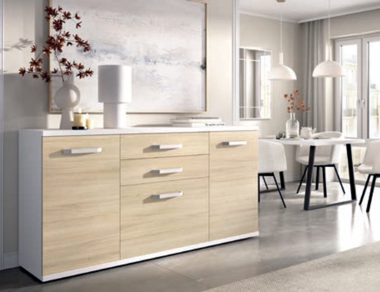 Acabado en contraste Blanco y tono Madera (Nordic/Roble).