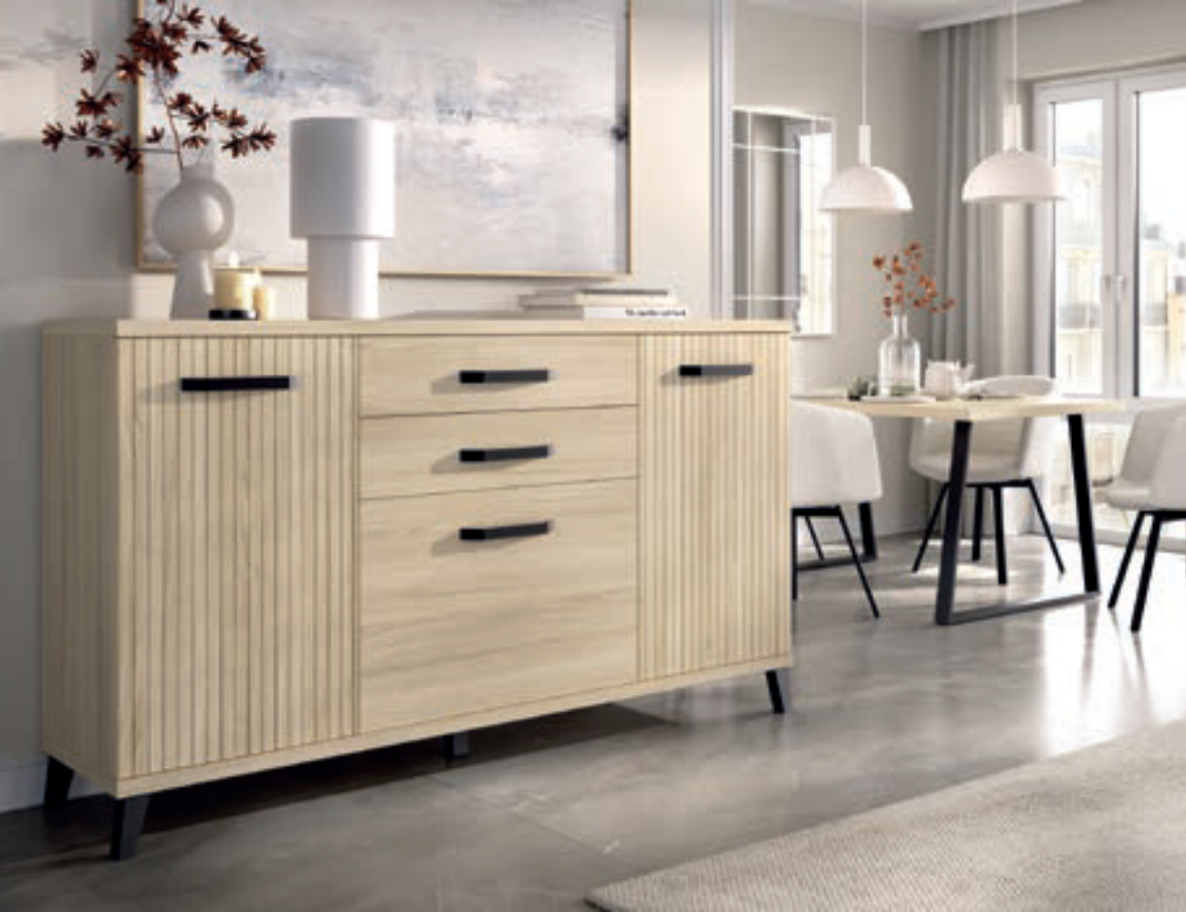 Frontal del mueble de televisión con textura alistonada en las puertas.