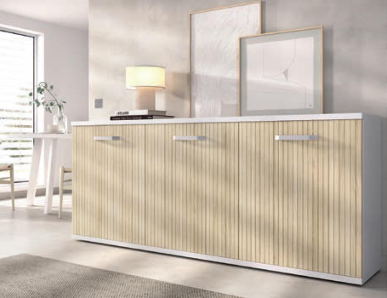 Frontal del mueble de televisión con textura alistonada en las puertas.