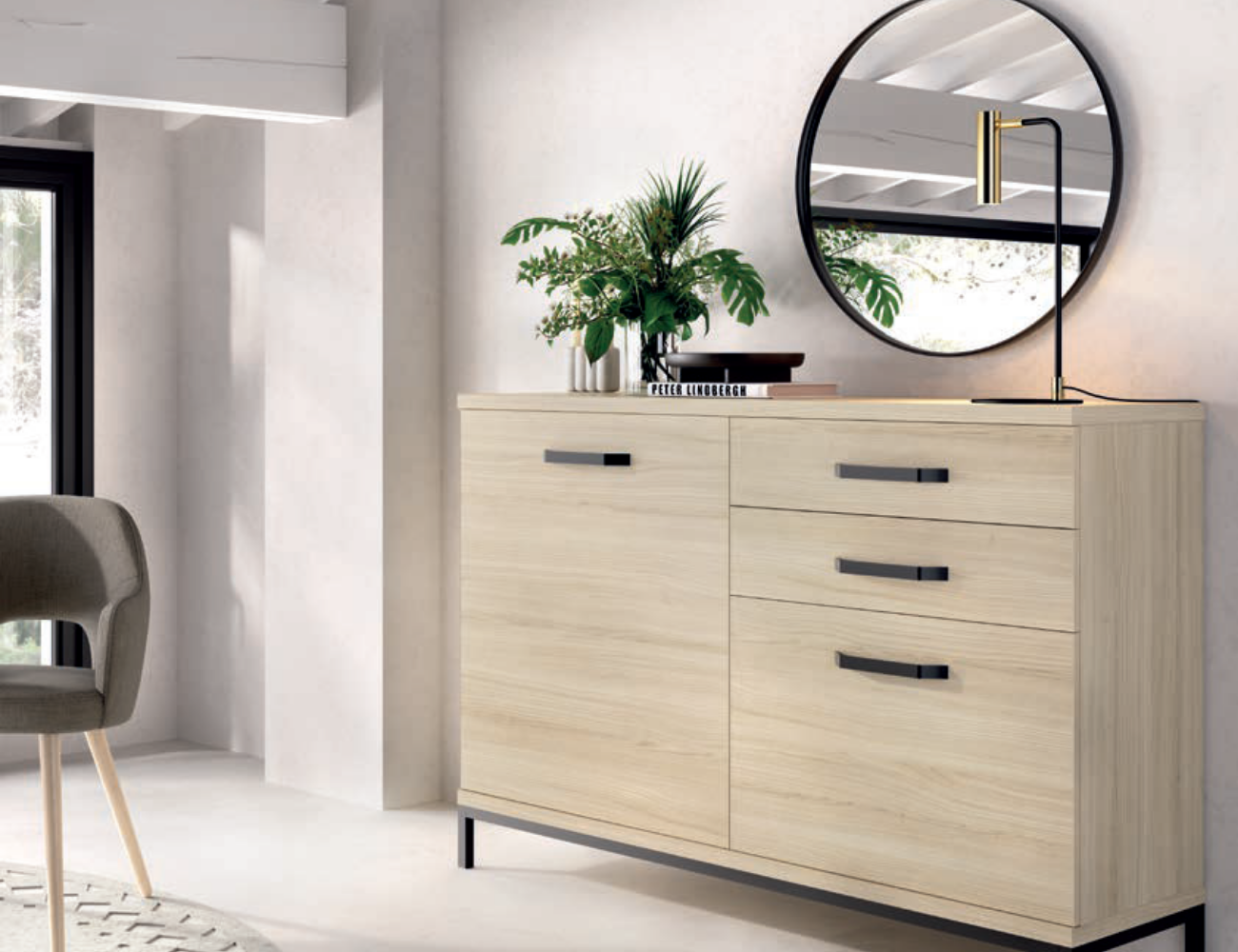 Composición simple, integrada únicamente por un mueble de televisión bajo y alargado.