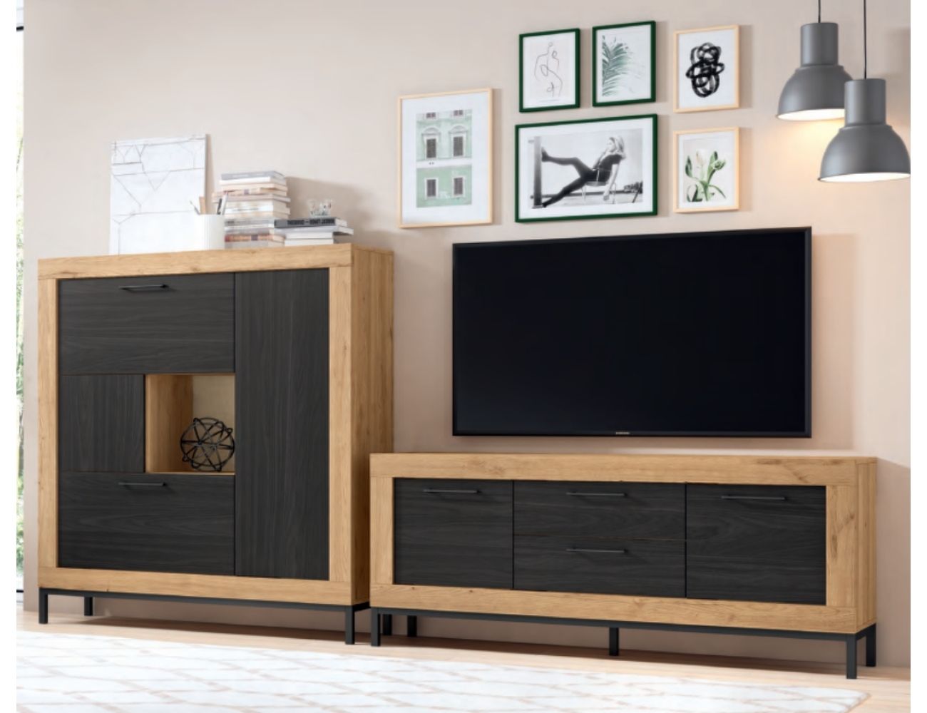 PVPR: 1227,57 € 736,54 €La combinación del Naturale con el Bocamina crea una atmósfera natural al igual que elegante. En el detalle podemos apreciar la robustez de las molduras en 30mm en el módulo de TV y el tirador Nest que presenta la serie en todos sus módulos.