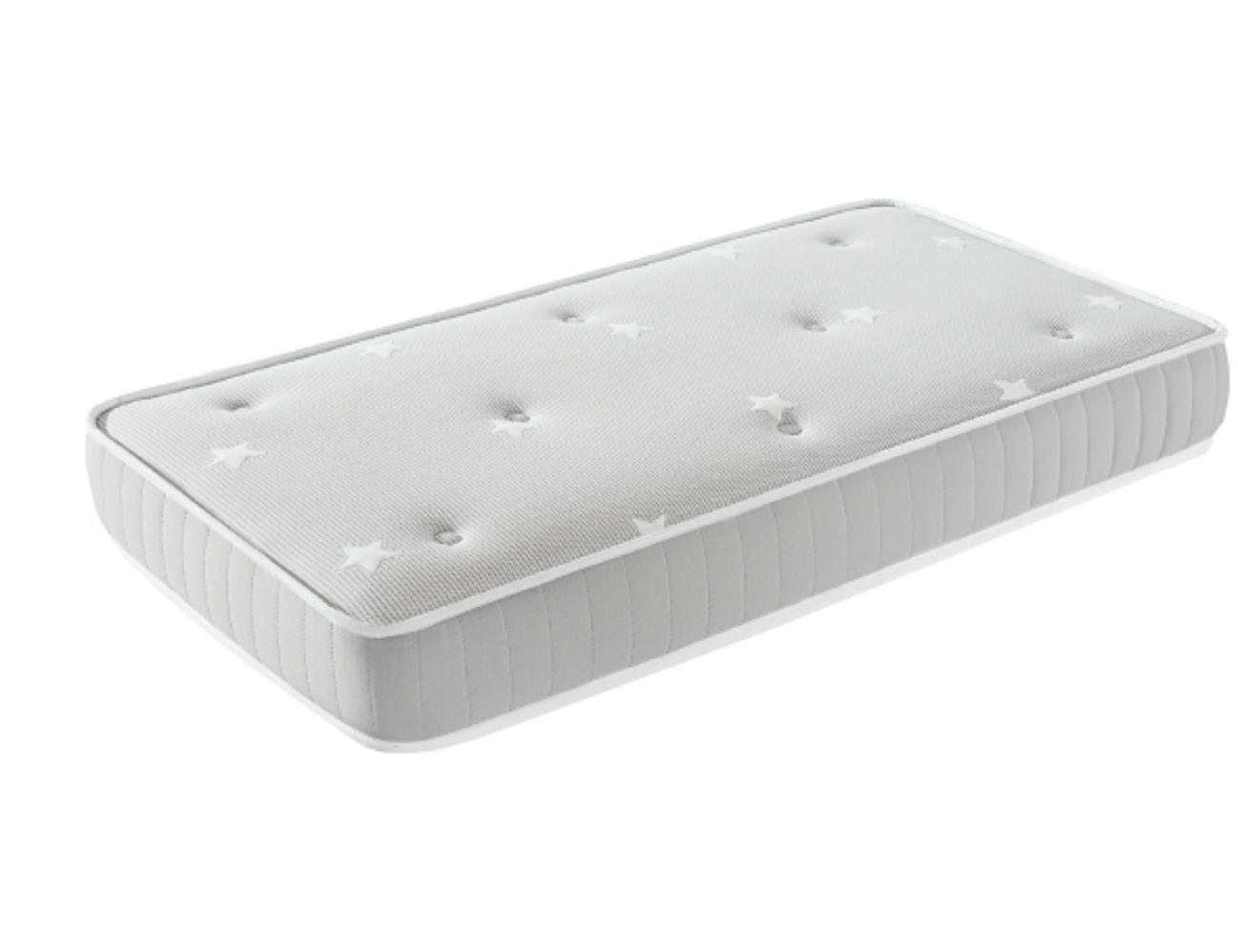 Diseño del producto: El colchón presenta un acabado blanco con pequeños detalles de estrellas en la superficie y una platabanda acolchada en tejido strech perla.