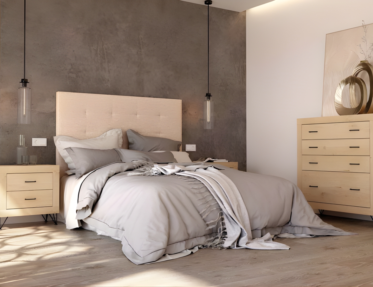 PVPR: 1533,91 € 920,35 €Este dormitorio es de estilo moderno, combina cabeceros de varios estilos. Los muebles, como las mesitas, cómodas o sinfonieres están disponibles con patas y sin patas.