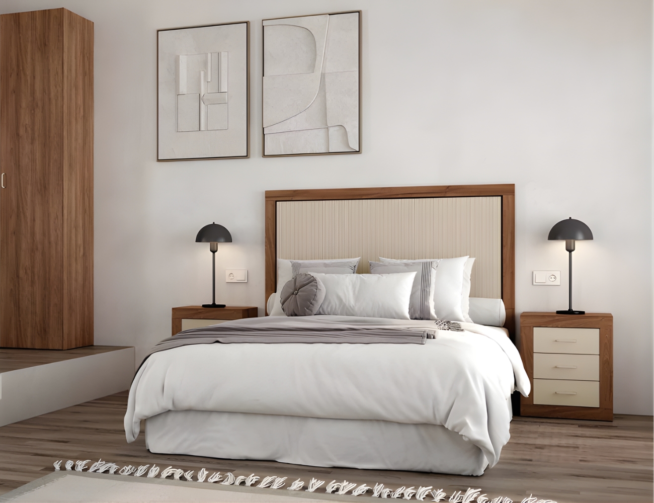 PVPR: 777,68 € 466,61 €Este dormitorio es de estilo moderno, combina cabeceros de varios estilos. Los muebles, como las mesitas, cómodas o sinfonieres están disponibles con patas y sin patas.