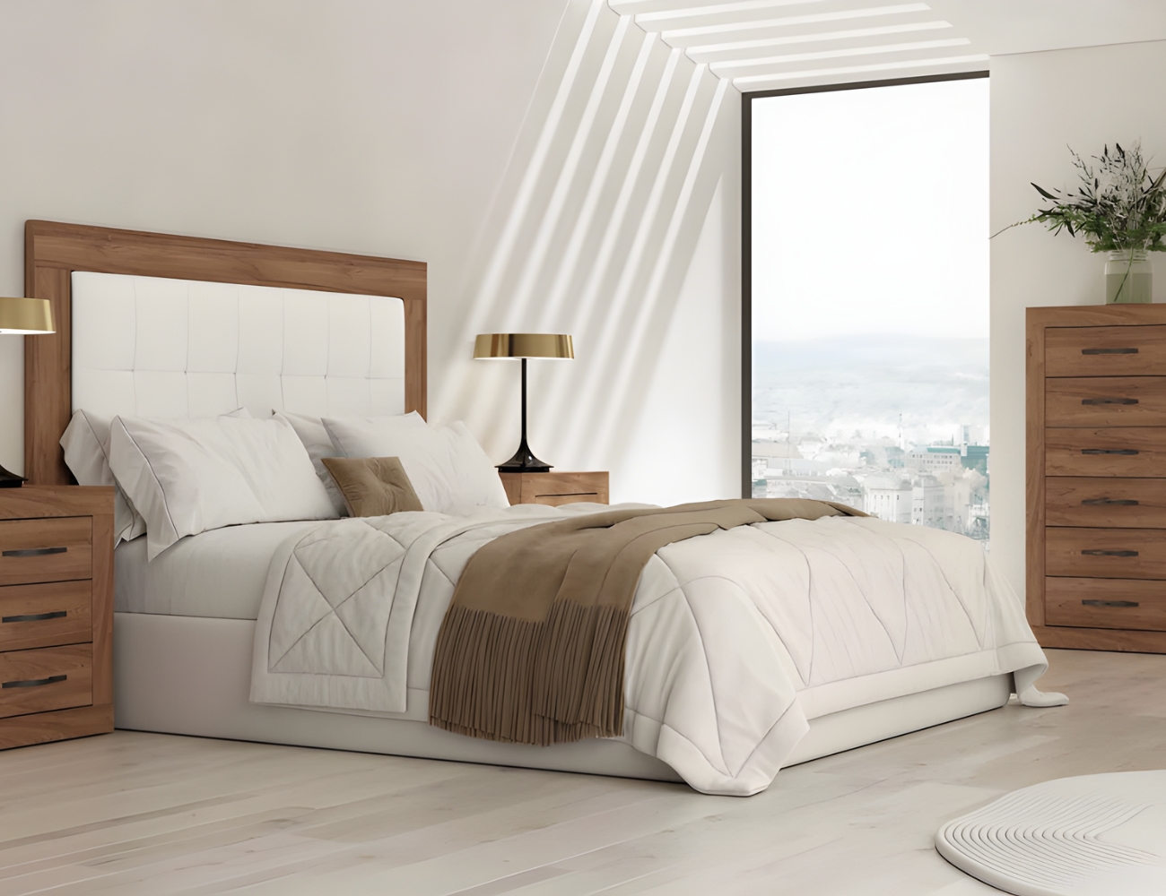 PVPR: 1785,99 € 1071,59 €Este dormitorio es de estilo moderno, combina cabeceros de varios estilos. Los muebles, como las mesitas, cómodas o sinfonieres están disponibles con patas y sin patas.