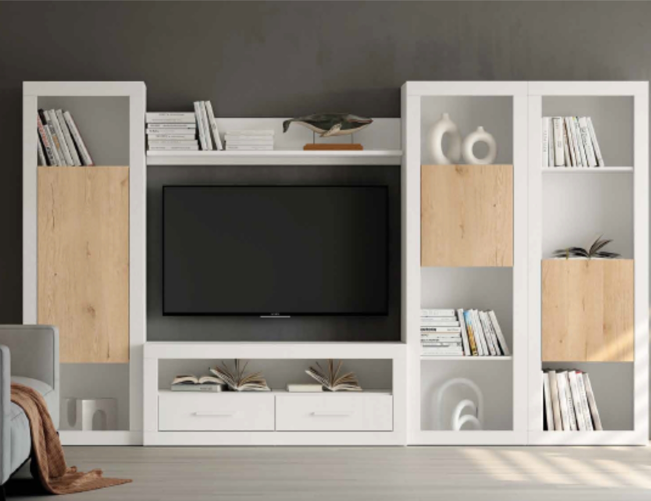 Esta composición es de estilo moderno, combina muebles de varios estilos. Los muebles, como las mesas, estanterías o estantes están disponibles con partes opcionales separadas.