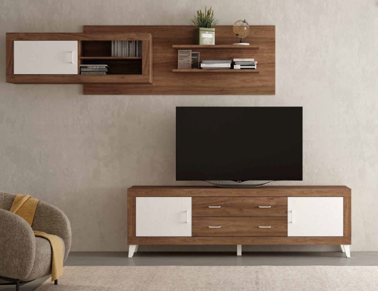 PVPR: 1492,27 € 895,36 €Esta composición es de estilo moderno, combina muebles de varios estilos. Los muebles, como las mesas, estanterías o estantes están disponibles con partes opcionales separadas.