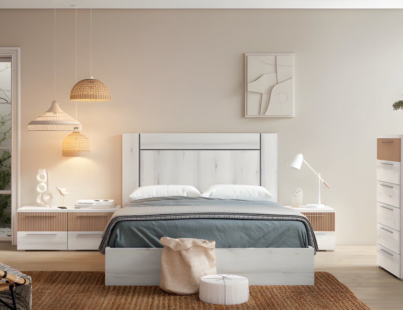 PVPR: 1588,28 € 952,97 €Este dormitorio es de estilo moderno, combina cabeceros de varios estilos. Los muebles, como las mesitas, cómodas o sinfonieres están disponibles con patas y sin patas
