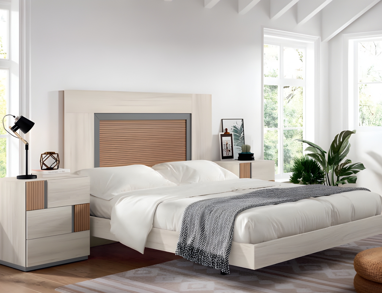 PVPR: 973,68 € 584,21 €Este dormitorio es de estilo moderno, combina cabeceros de varios estilos. Los muebles, como las mesitas, cómodas o sinfonieres están disponibles con patas y sin patas