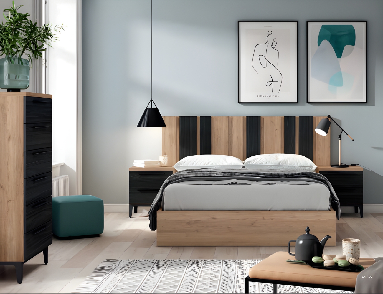 PVPR: 1184,84 € 710,91 €Este dormitorio es de estilo moderno, combina cabeceros de varios estilos. Los muebles, como las mesitas, cómodas o sinfonieres están disponibles con patas y sin patas