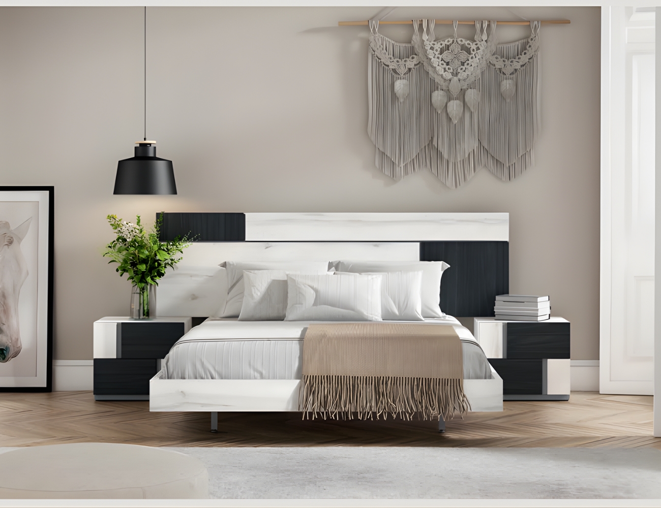 Este dormitorio es de estilo moderno, combina cabeceros de varios estilos. Los muebles, como las mesitas, cómodas o sinfonieres están disponibles con patas y sin patas