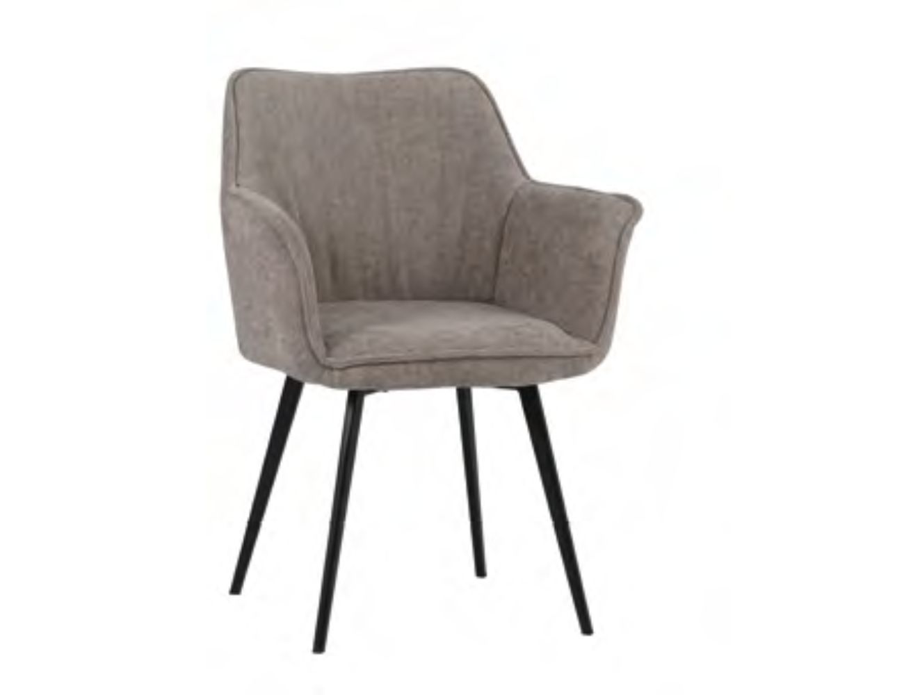 Silla de diseño tipo sillón con una estructura robusta y acogedora. Cuenta con un respaldo de altura media y reposabrazos integrados que fluyen de manera continua, ofreciendo un soporte ergonómico superior. Su tapizado de alta calidad en tono tierra se combina con unas patas metálicas de diseño cónico, creando una pieza equilibrada que aporta calidez y sobriedad a cualquier estancia.