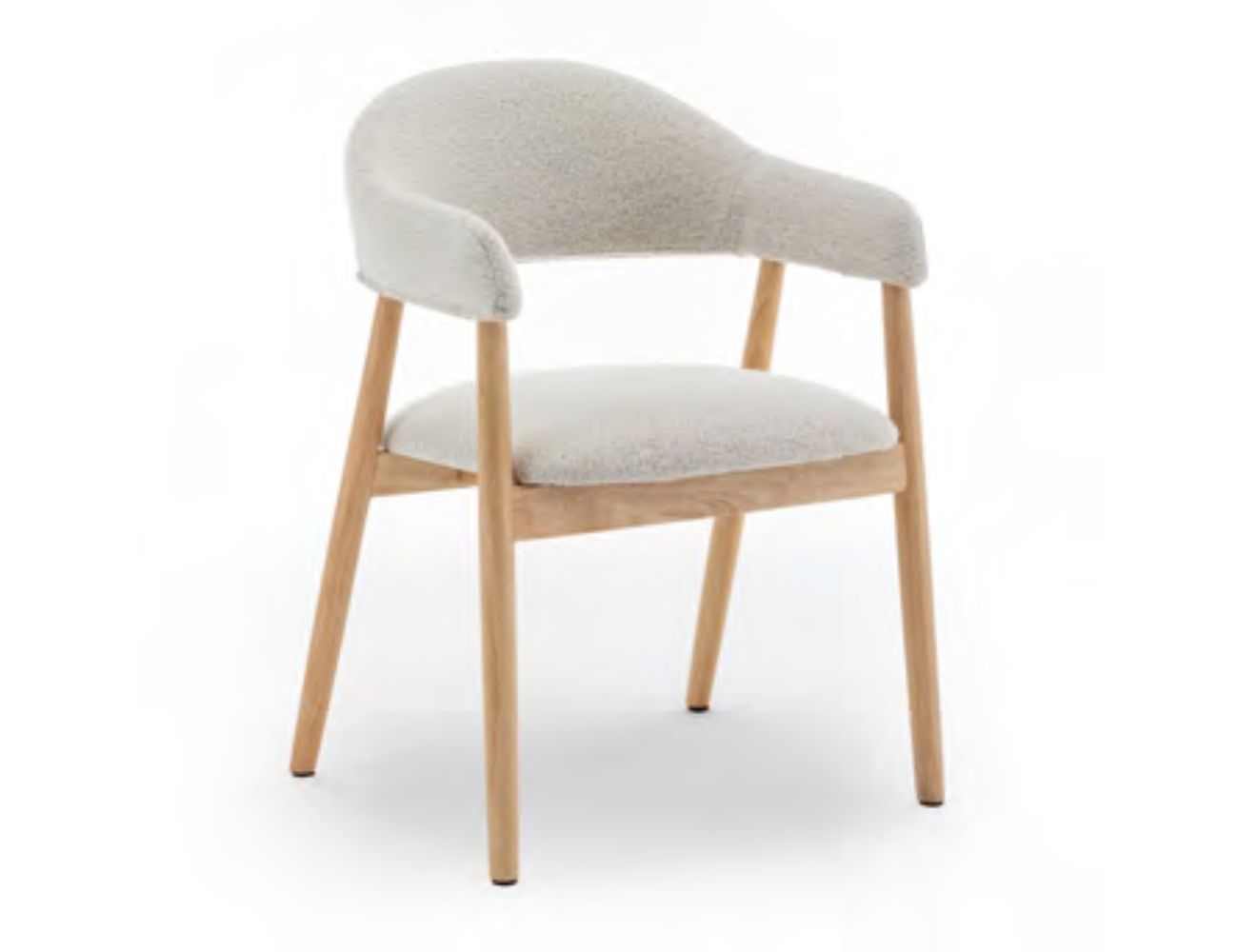 Silla de diseño tipo sillón con una estética orgánica y acogedora que evoca la calidez del diseño nórdico artesanal. Su estructura destaca por un respaldo envolvente y semicircular que fluye hacia los reposabrazos, proporcionando una sentada de máximo confort. El tapizado de textura suave en tono claro se integra armoniosamente con una base de cuatro patas de madera maciza en acabado natural, creando una pieza luminosa y sofisticada ideal para comedores de estilo contemporáneo o ambientes con un toque escandinavo.