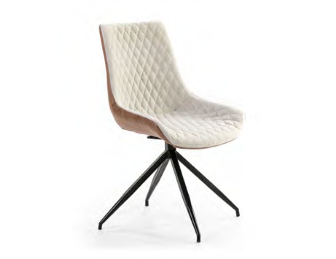 Silla de diseño dinámico y sofisticado que destaca por su elegante tapizado capitoné con patrón de rombos en el frontal. Presenta una silueta ergonómica de líneas fluidas, realzada por un acabado combinado que aporta un fuerte carácter decorativo. Incorpora una base giratoria de $360^{\circ}$ sobre patas metálicas en disposición radial, proporcionando movilidad y una estética vanguardista. Es una pieza ideal para comedores modernos o espacios de trabajo que buscan fusionar confort y estilo.