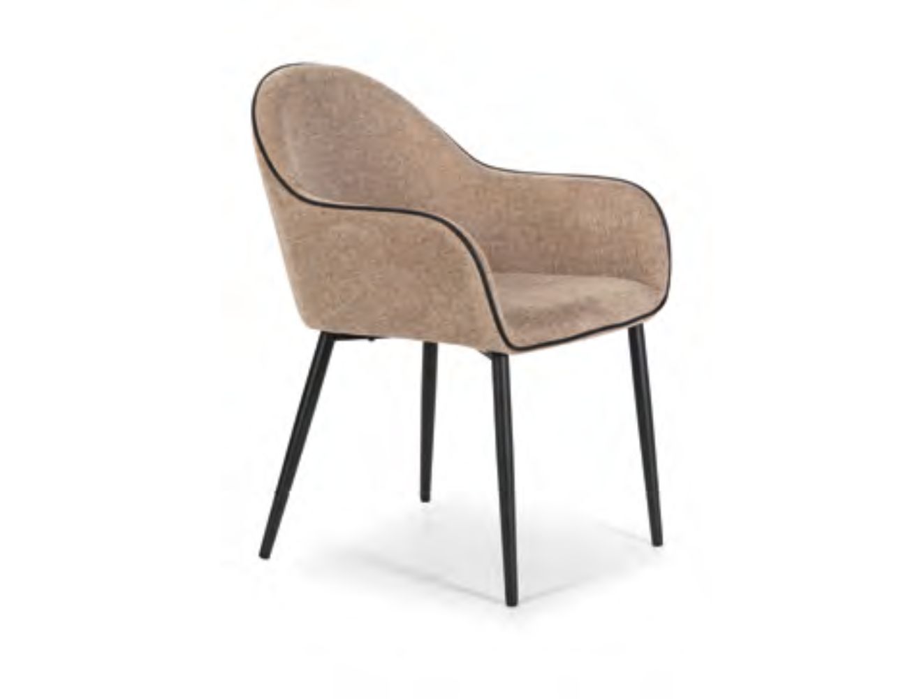 Silla de diseño tipo sillón que destaca por sus líneas fluidas y una estética de inspiración retro-moderna. Presenta un asiento y respaldo de una sola pieza con reposabrazos integrados de perfil bajo, acentuados por un elegante vivo oscuro que resalta su contorno. Su tapizado de textura suave ofrece una experiencia de sentada acogedora, mientras que su estructura de cuatro patas metálicas estilizadas en color negro garantiza estabilidad con una presencia visual ligera y sofisticada.