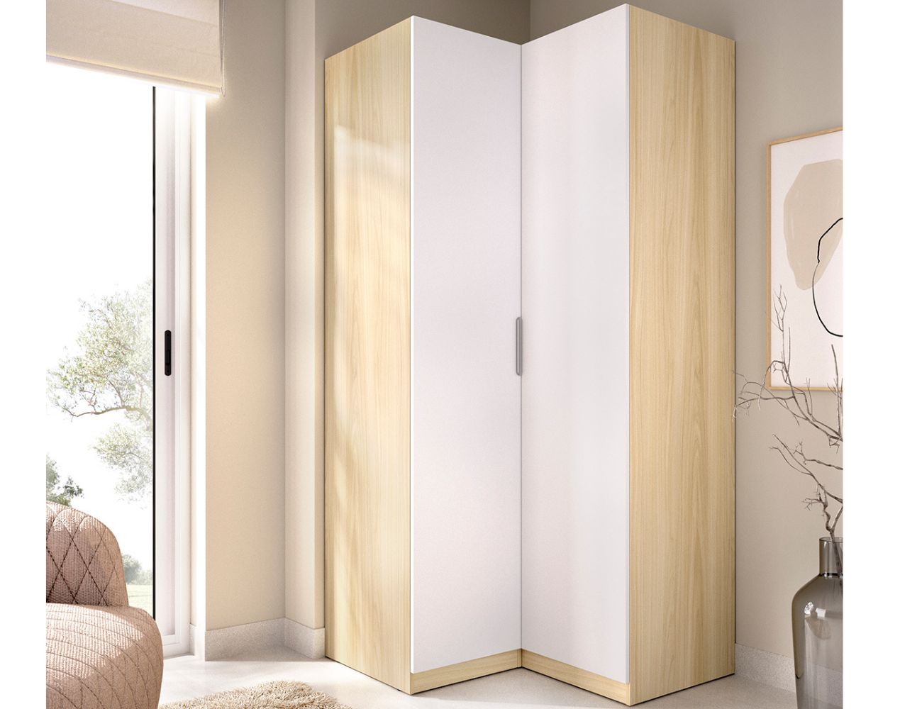 PVPR: 507,47 € 304,48 €Armario rincón formado por dos columnas, una estrecha con estantes y la otra con barra y estante de colgar alto.