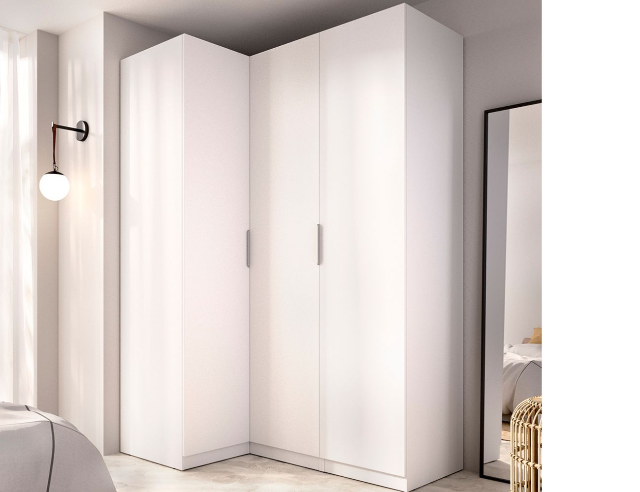 PVPR: 655,56 € 393,34 €Armario rincón 3 puertas formado por tres columnas, dos estrechas con estantes y la otra con barra y estante de colgar alto.