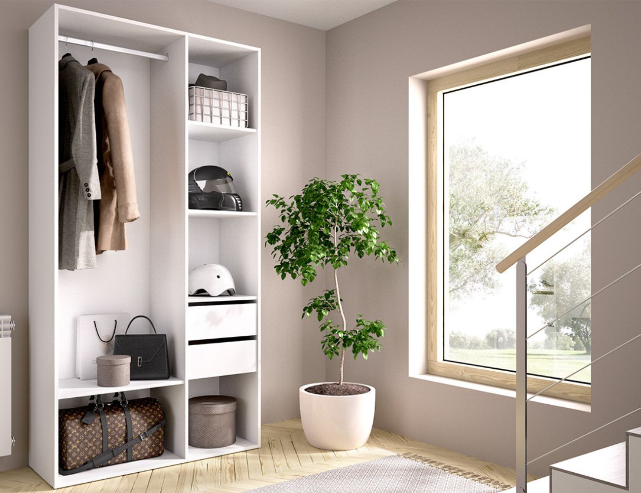 PVPR: 328,00 € 196,80 €Vestidor compuesto por una barra de colgar con un estante y una columna con 3 estantes y dos cajones.