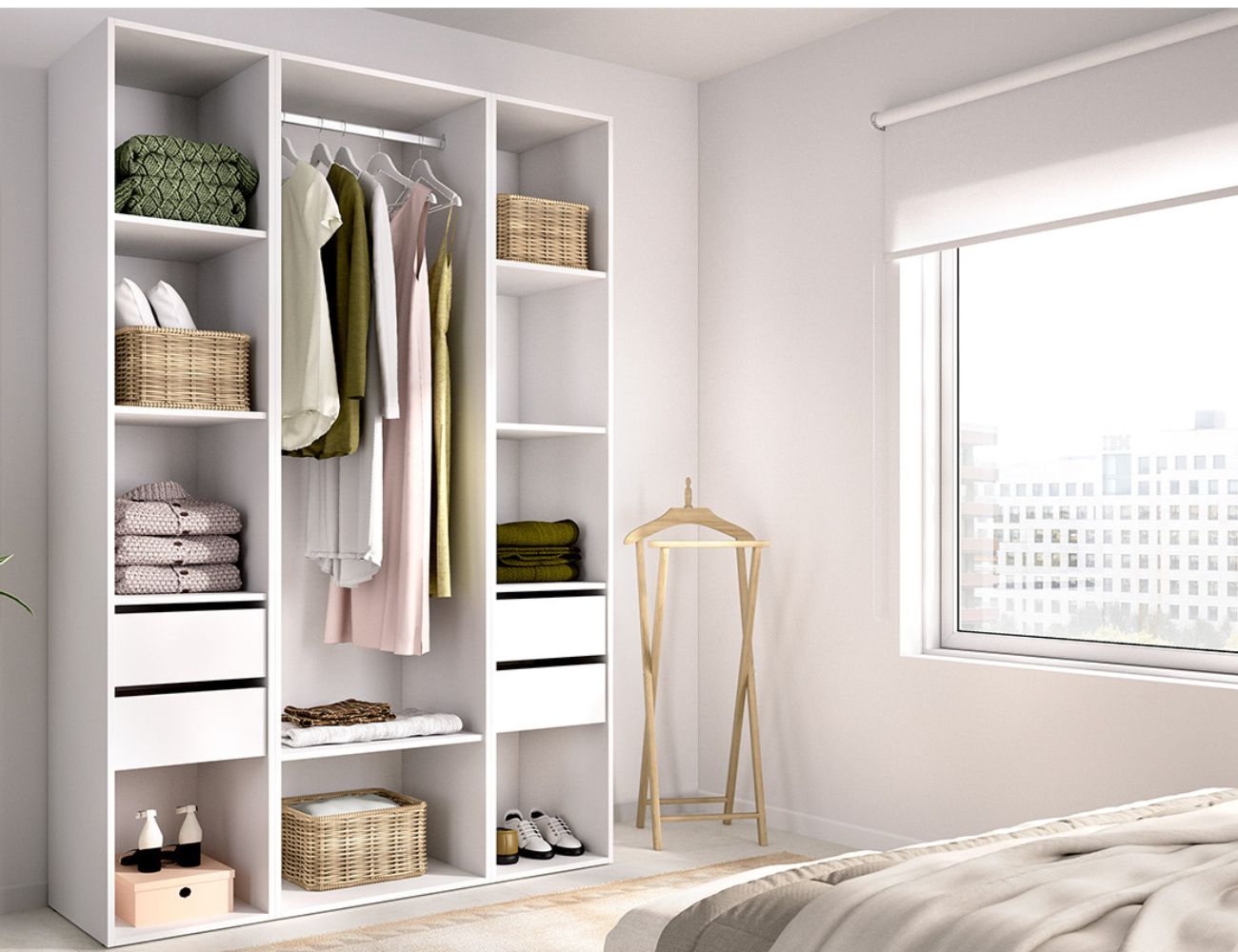 PVPR: 516,97 € 310,18 €Conjunto vestidor compuesto por tres columnas, dos de ellas con dos cajones y 4 huecos y la central con estante y barra de colgar.