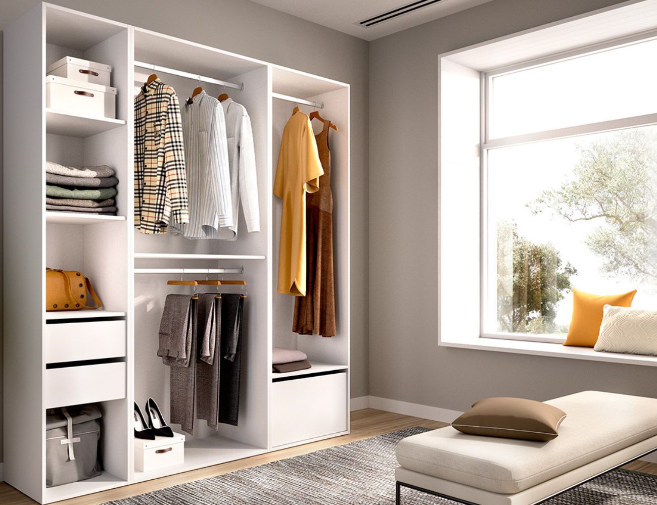 PVPR: 614,90 € 368,94 €Conjunto vestidor compuesto por tres columnas, una con dos cajones y 4 huecos y la central con estante y 2 barras de colgar y la otra con zapatero y barra.