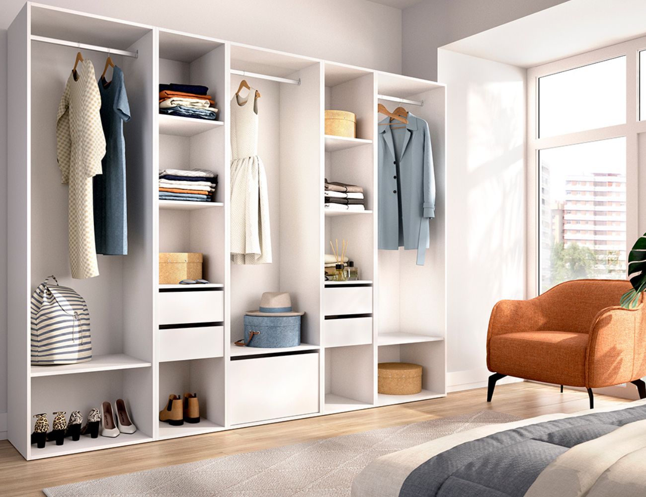 PVPR: 856,85 € 514,11 €Conjunto vestidor compuesto por 5 columnas, con 4 cajones , zapatero inferior en la parte central, 3 barras de colgar y multiples estantes.