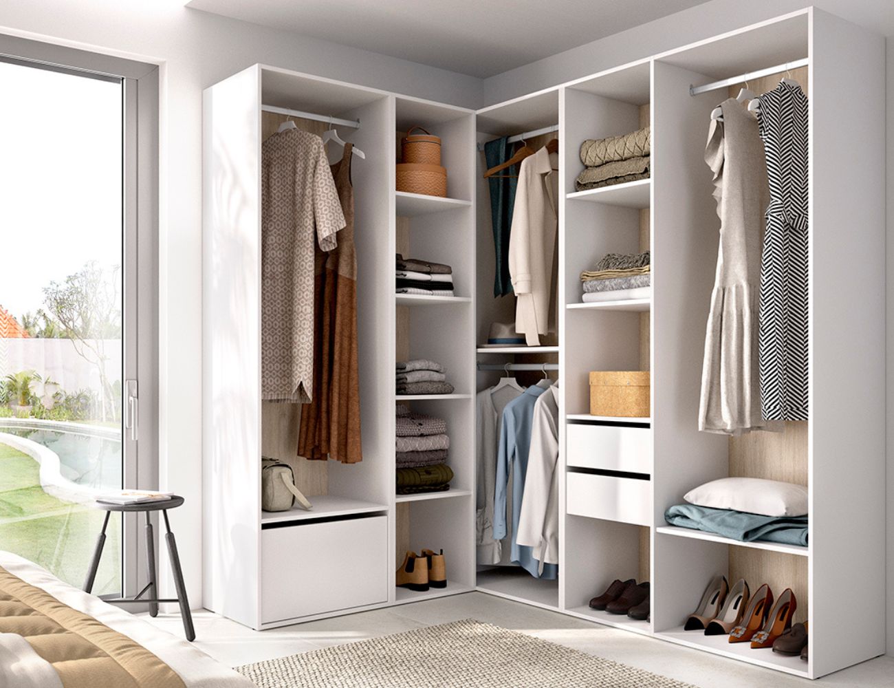 PVPR: 881,15 € 528,69 €Conjunto vestidor de rincón compuesto por cinco columnas, con 2 cajones, 1 zapatero, 4 zonas barras de colgar y múltiples estantes.