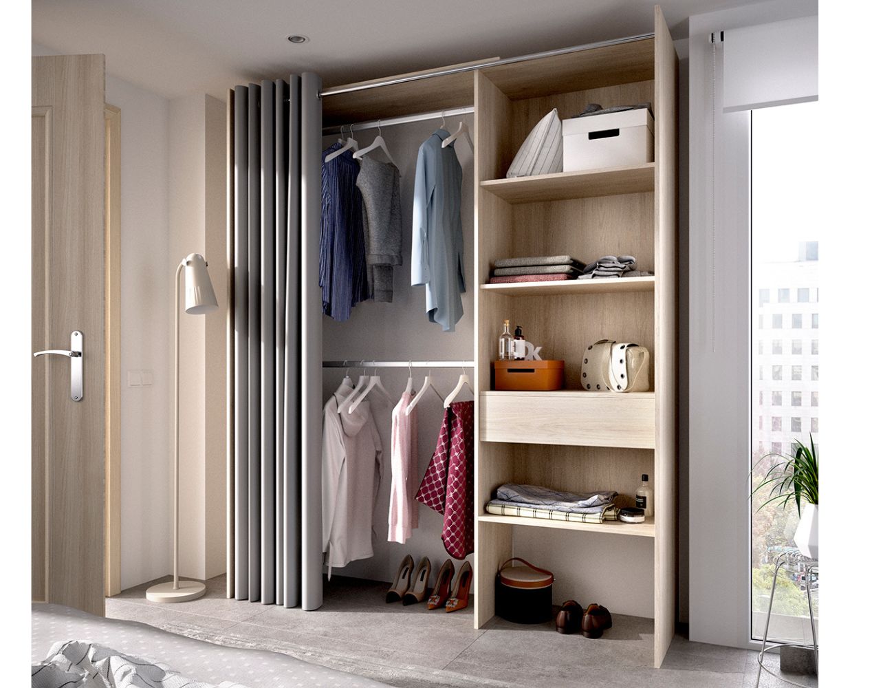 PVPR: 346,60 € 207,96 €Vestidor adaptable cortando las barras. Está compuesto por dos barras de colgar, cuatro estantes y un cajón, más una barra con cortina.