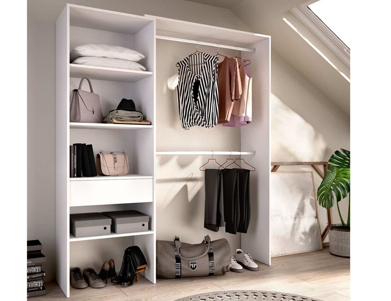 PVPR: 216,81 € 130,09 €Vestidor adaptable cortando las barras. Está compuesto por dos barras de colgar, cuatro estantes y un cajón.
