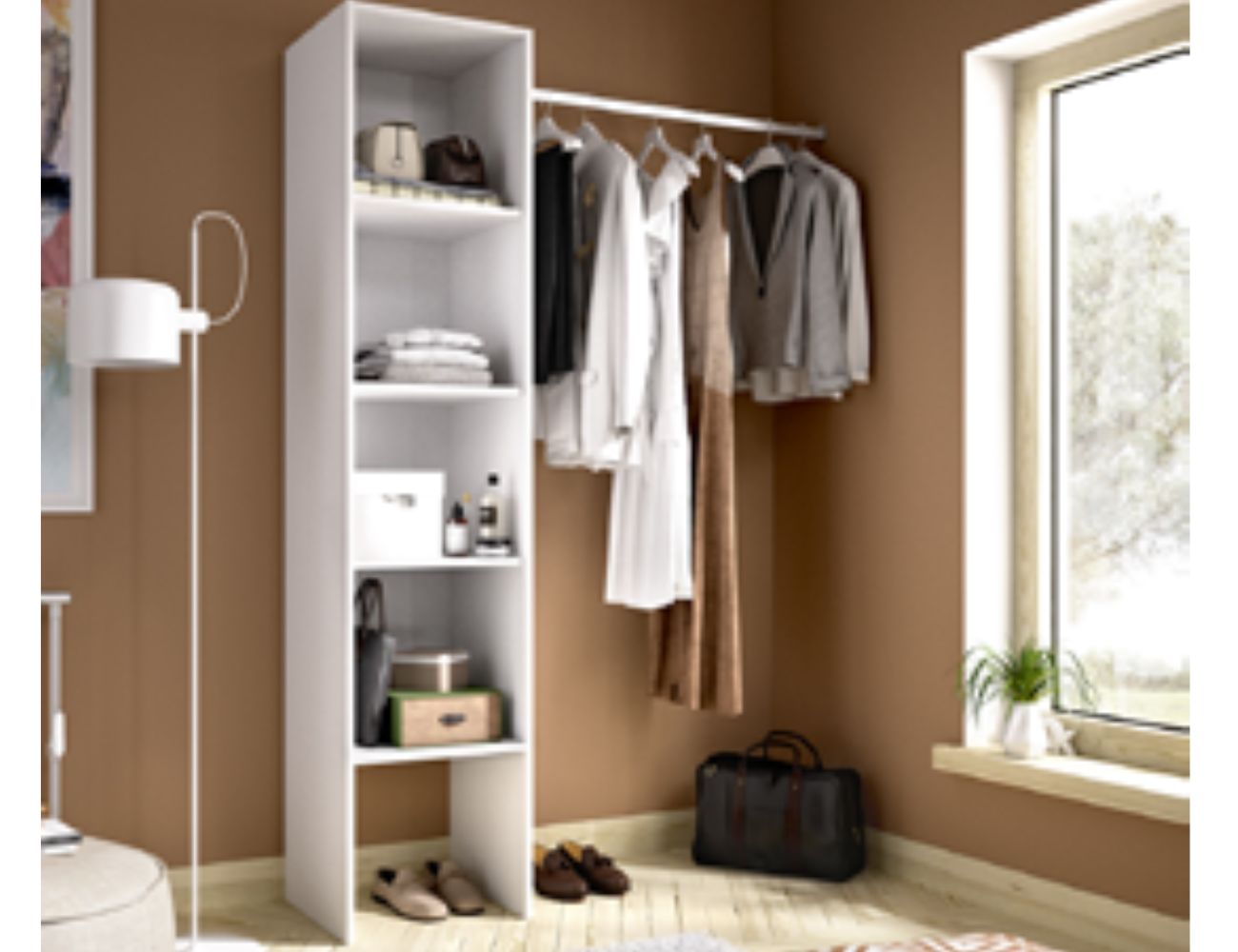 PVPR: 143,42 € 86,05 €Kit vestidor compuesto por una columna con 4 estantes y una barra.