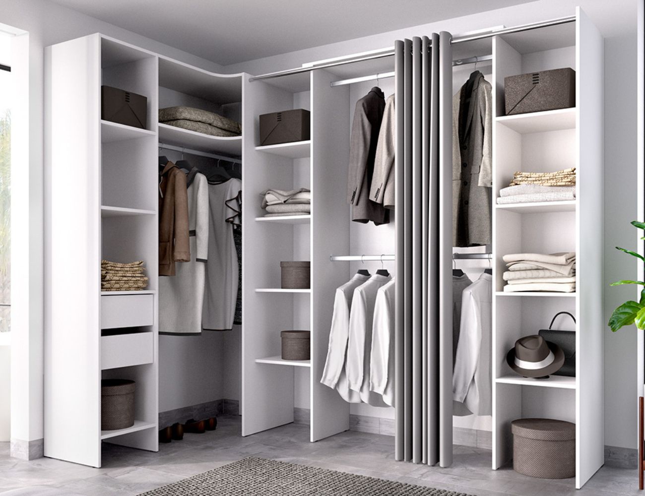PVPR: 673,60 € 404,16 €Conjunto vestidor de rincón formado por los módulos K140+K148. Con mucha capacidad de almacenaje, uno de los laterales del conjunto dispone de cortina de ocultación. El lateral largo es adaptable cortando las barras de colgar.