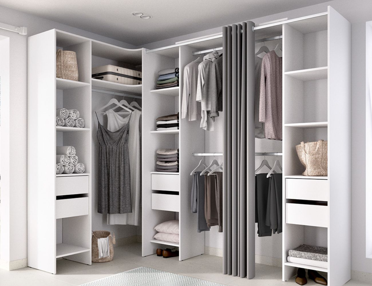 PVPR: 747,87 € 448,72 €Conjunto vestidor de rincón formado por los módulos K147+K148. Con mucha capacidad de almacenaje, uno de los laterales del conjunto dispone de cortina de ocultación. El lateral largo es adaptable cortando las barras de colgar.